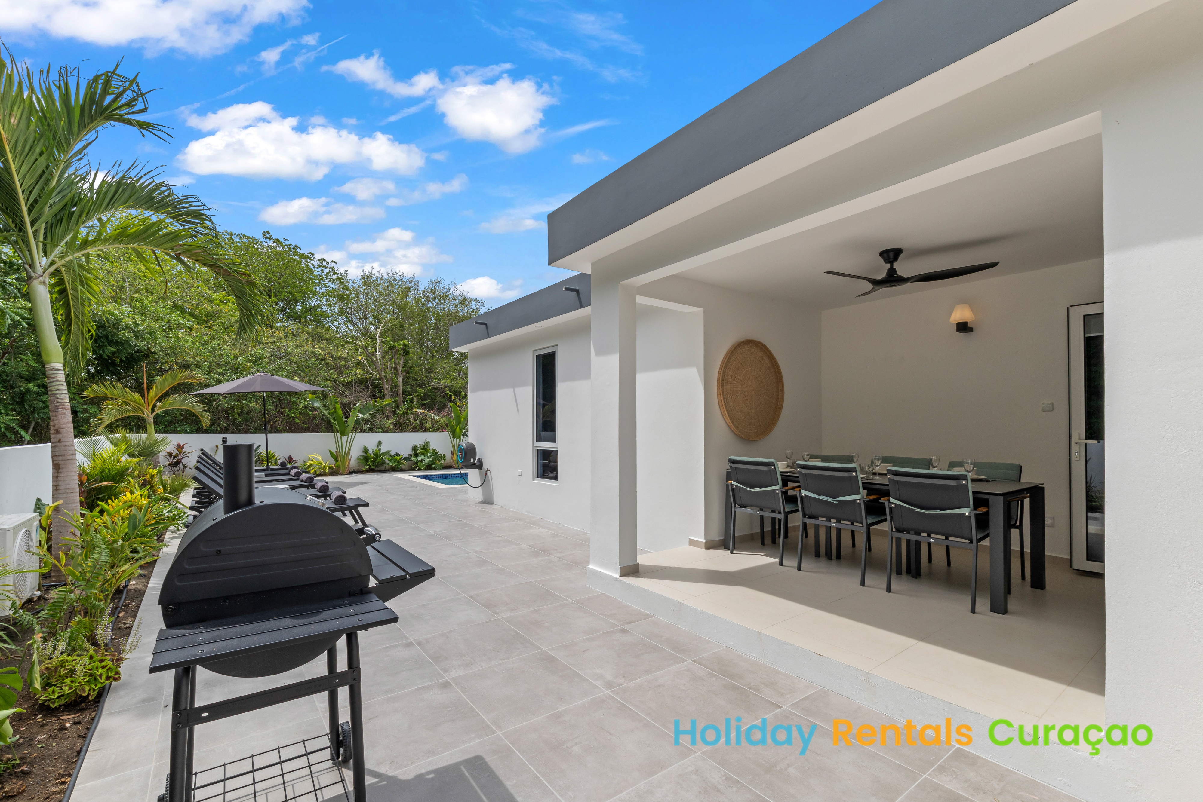 - Buitenruimte: Privézwembad, 6 ligstoelen, hangmat, palapa en barbecue en tuinverlichting.
